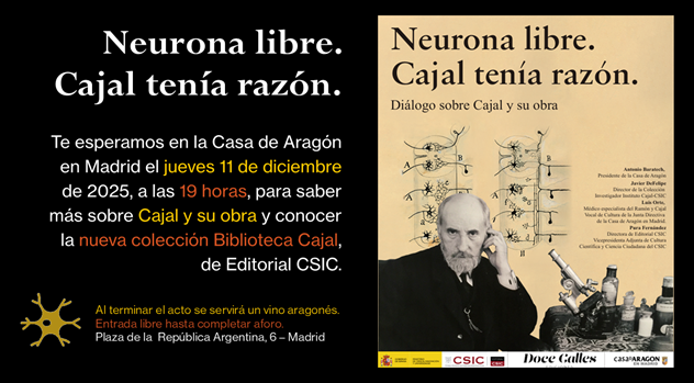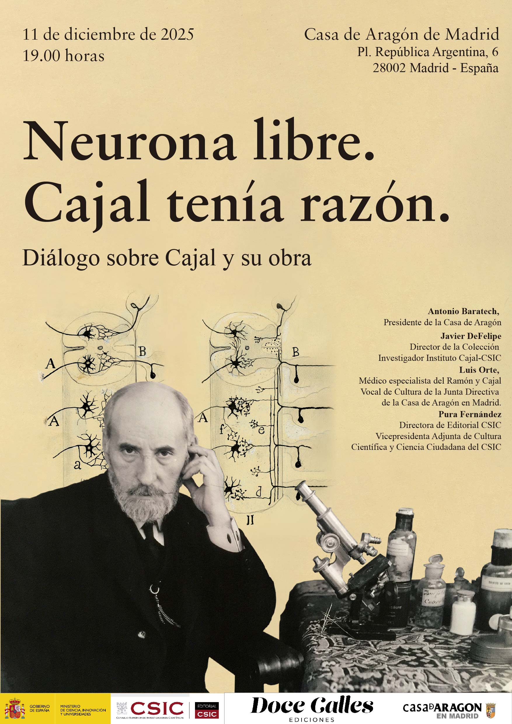 La Casa de Aragón en Madrid tiene el placer de invitarle al acto Neurona libre. Cajal tenía razón, que se celebrará el jueves 11 de diciembre de 2025, a las 19 horas, en la sede de la Casa de Aragón en Madrid (Plaza República Argentina, 6).