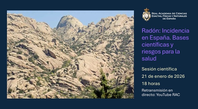 La sección de Ciencias Naturales y de Físicas y Químicas de la Real Academia de Ciencias Exactas, Físicas y Naturales de España se complace en invitarle a la sesión científica Radón: Incidencia en España. Bases científicas y riesgos para la salud, que se celebra el próximo 21 de enero, a las 18 horas, con el siguiente programa: